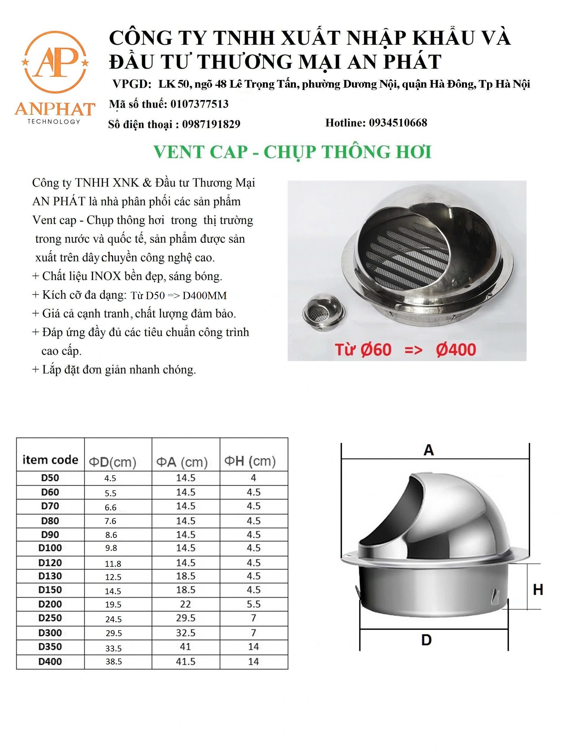 Công ty TNHH Cơ Điện AN PHÁT là đơn vị chuyên sản xuất và kinh doanh lâu năm sản phẩm Vent Cap - Chụp thông hơi phân phối cho cả thị trường trong và ngoài nước. Sản phẩm Vent Cap của Cơ Điện An Phát được sản xuất trên dây chuyền công nghệ cao