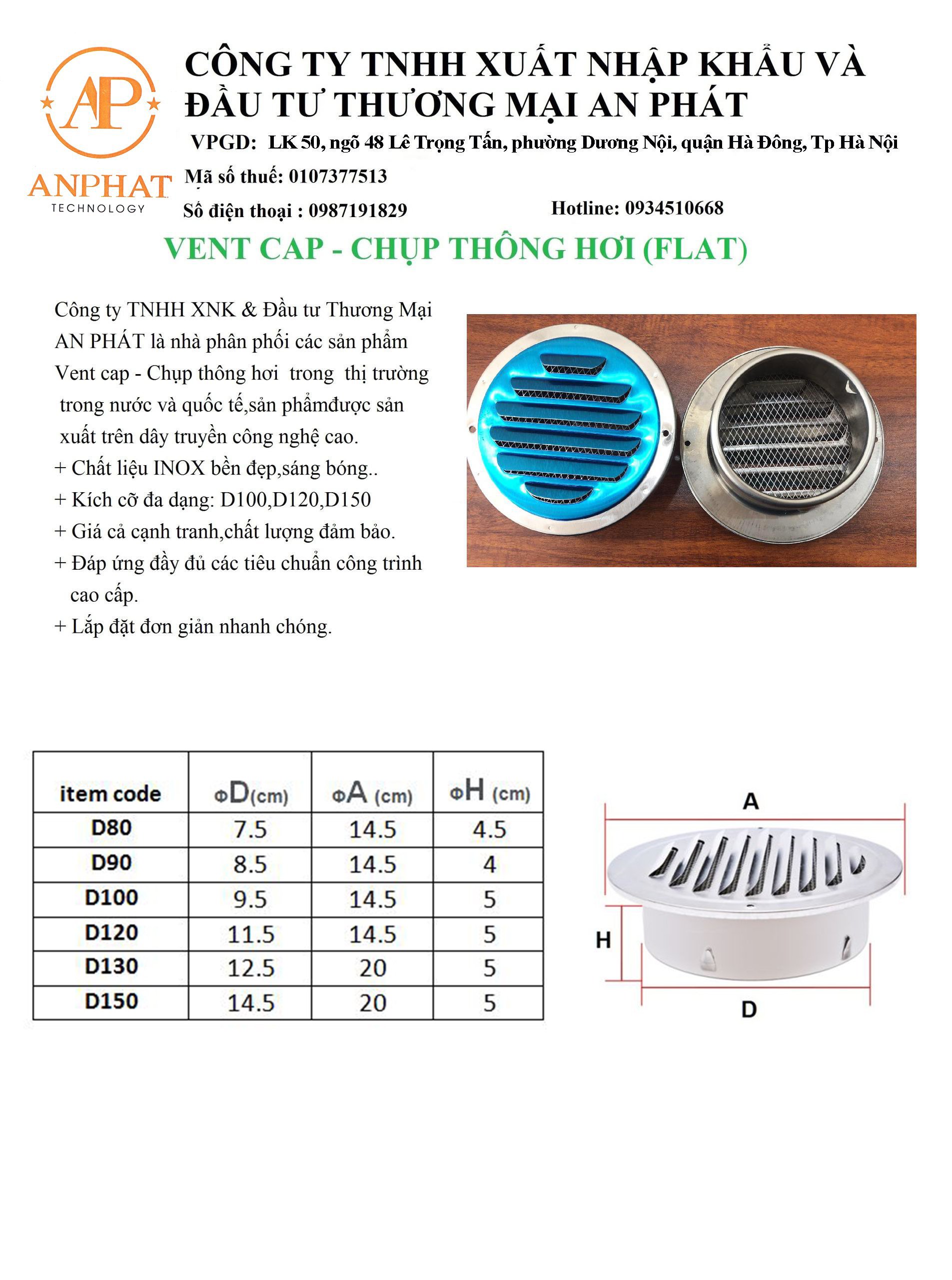 Vent Cap (Circular Outlet) hay còn gọi là Chụp thông hơi là sản phẩm được sử dụng trong các ứng dụng thông gió của các công trình, thông gió cho phòng bếp, phòng tắm và các các vị trí khác của tòa nhà tùy theo nhu cầu sử dụng.